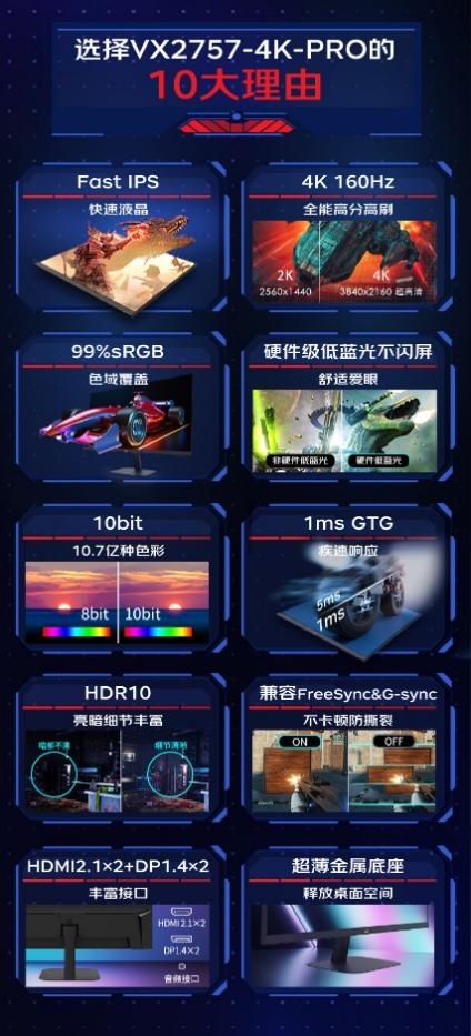 优派vx2757-4k-pro拥有原生160hz高刷新率和3840 x 2160超高清分辨率,乃40系显卡完美搭档,以及1ms gtg疾速响应时间,带来震撼顺滑的游戏新享受,实战更精彩战斗更得心应手。