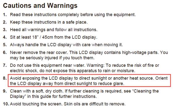 please avoid exposing the monitor to direct sunlight or glare reflection as mentioned in the user guide as below.